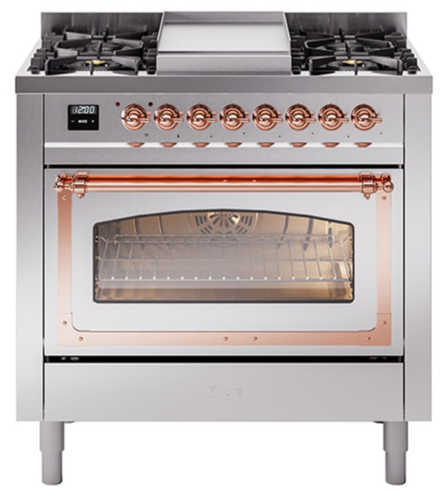 Introducing the new Nostalgie II 36" dual fuel range, a classic addition with a touch of innovation to any kitchen. This range feature sealed burners equipped with total black brass burner that has a non-stick nanotechnological coating, heavy cast iron grates, 3.5 cu. ft. total oven capacity and soft closing door system.Read More